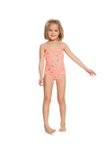 Un divertido bañador para niña con estampado con pequeños dibujos de temática playera, frescos para realzar el moreno. La parte superior esta fruncido y los tirantes son ajustables. El tejido es súper suave, ligero y elástico de protección solar UPF 50
