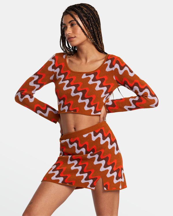 Confeccionada en tejido de punto suave y elástico, esta falda se adapta al cuerpo ofreciendo comodidad y libertad de movimiento. El color Caramel, combinado con su estampado ondulado en tonos cálidos, crea una prenda con personalidad que destaca dentro de la ropa RVCA mujer.